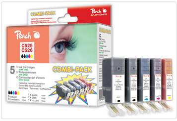 Zu den beliebtesten Peach Druckerpatronen zählen derzeit die Peach Canon CLi-526 Tintenpatronen und die Canon PGi-525 Patronen. Diese kann man bequem im Multipack sehr günstig bestellen. Die Ersatzpatronen verfügen alle über einen Chip, so dass sie wie von den Originalpatronen gewönt als neue, volle Tintenpatrone vom Drucker erkannt werden. Auch die Tintenfüllstandskontrolle funktioniert ganz normal bei den Peach Canon PGi-525 Tintenpatronen und CLi-526 Druckerpatronen. Bestellen kann man das Multipack hier im Onlineshop: